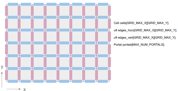 The edges are single-bit entries, to keep things efficient. If we need more information, we can index into a separate array. I’m currently using the first two bits to identify the edge type, and the remaining 6 bits, if the edge is a portal, index into a Portal array. The Portal stores the information necessary to know which two edges it links.