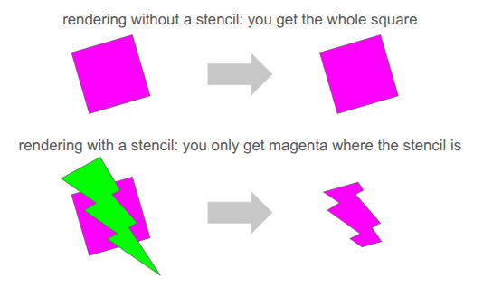 We’ve already been using several buffers when rendering. We’re writing to the RGB color buffers, and 3D occlusion is handled via the depth buffer. The stencil buffer is just an additional buffer (here, one byte per pixel), that we can use to get a stenciling effect.