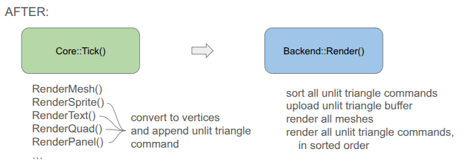 Furthermore, we want to order the render commands such that opaque things are drawn front to back, and transparent things are then drawn back to front, and finally drawing UI elements in order at the end. That would require sorting across command types, which seems really messy.