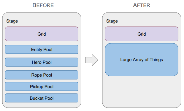 A depiction of the change in the data structure used to represent game entities, going from type-specific lists with a top-level entity table to a single large array of things.