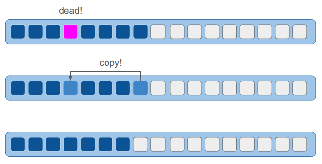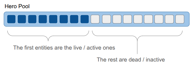 Keeping the live entities packed in the front makes iteration over the entities really fast. We only need to iterate over the first N elements, and they are all sequential in memory.