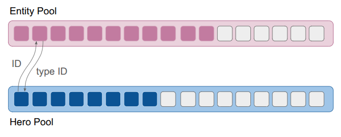 As discussed earlier, this system required that, given an EntityId, I first look up the Entity struct and then use the entity’s type to identify the type-specific pool and access the type-specific data via the type ID. In addition, actions on entities had to be specialized to each entity type, which made the event system complicated. Finally, I wasn’t taking advantage of the tightly packed object lists, so there wasn’t much keeping me on the current system other than momentum.