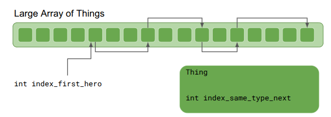 That works just fine, but we do have to (1) make sure to initialize all things with and (2) if we accidentally use index_same_type_next = kInvalidThingIndexthing.index_same_type_next with a bad index, we could go out-of-bounds. Anton recommended making all such reference lists circular: