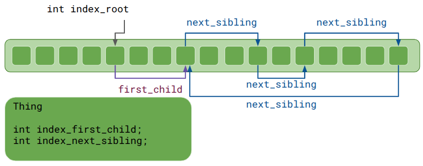 Each Thing has a head index to a list of children, which then reference each other using sibling indices.