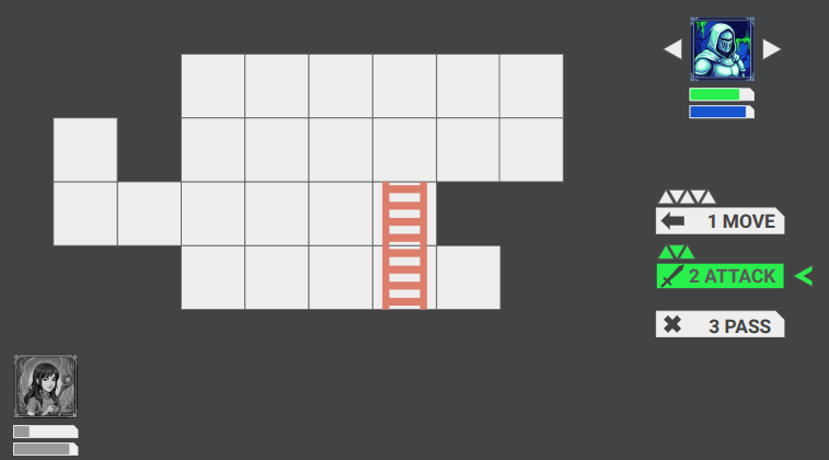 An action is a discrete state change available to an actor, such as passing the turn, moving through the environment, or attacking another actor. The available actions depend on the game state — an actor that is not yet deployed has a deploy action but no move action, and an actor with a bow should get an attack action with a ranged UI whereas an actor with a sword can only select the tiles within melee range.