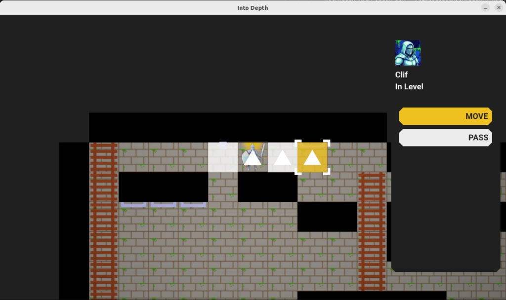 The move action highlights all valid target cells, allowing the player to select one to move to. Once selected, the shortest path to that cell is taken by the hero, and all consequences are simulated (e.g. falling, triggering a trap) and built into a schedule.